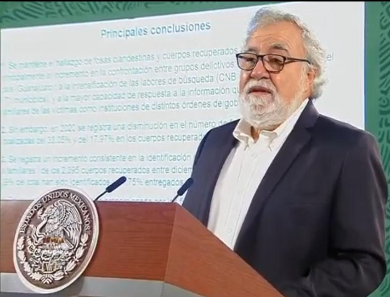 Alejandro Encinas dio a conocer que la Comisión Nacional de Búsqueda realizó acciones en 171 municipios. Destacó que en el 2020 el 92% de las personas desaparecidas fueron localizadas con vida. En 2020 se presentaron 6,957 denuncias de personas desaparecidas y no localizadas, lo que representan una disminución del 22.38% con respecto de 2019.